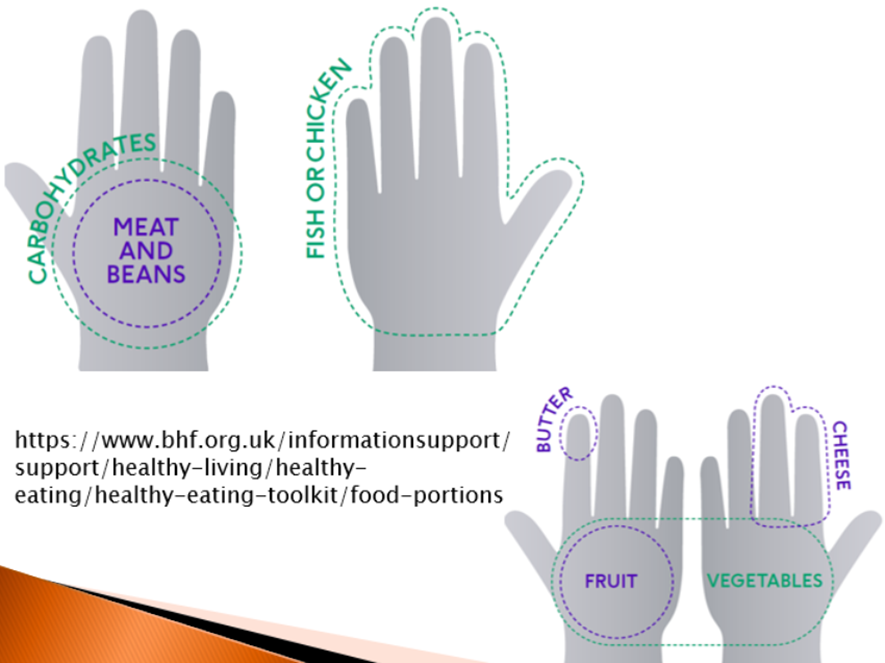 There are no standard guidelines for portion sizes in the UK. However, a simple way to work out the suitable portion size is to use our own hand as a guide.